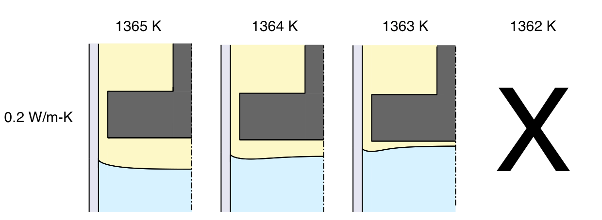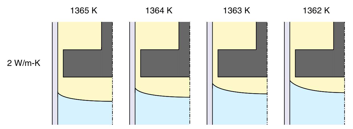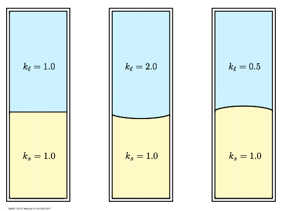 Before studying the effect of the insulating baffle it is worthwhile examining why interface bending occurs in the first place. Primary causes are unequal thermal conductivities in melt and solid, and latent heat of solidification. Convective heat transfer in the melt and ampoule conductivity are also important, but their effects on interface shape are secondary. In the following sections I walk you through the basics of Bridgman growth by explaining how each of these factors influence interface shape, both individually and collectively.