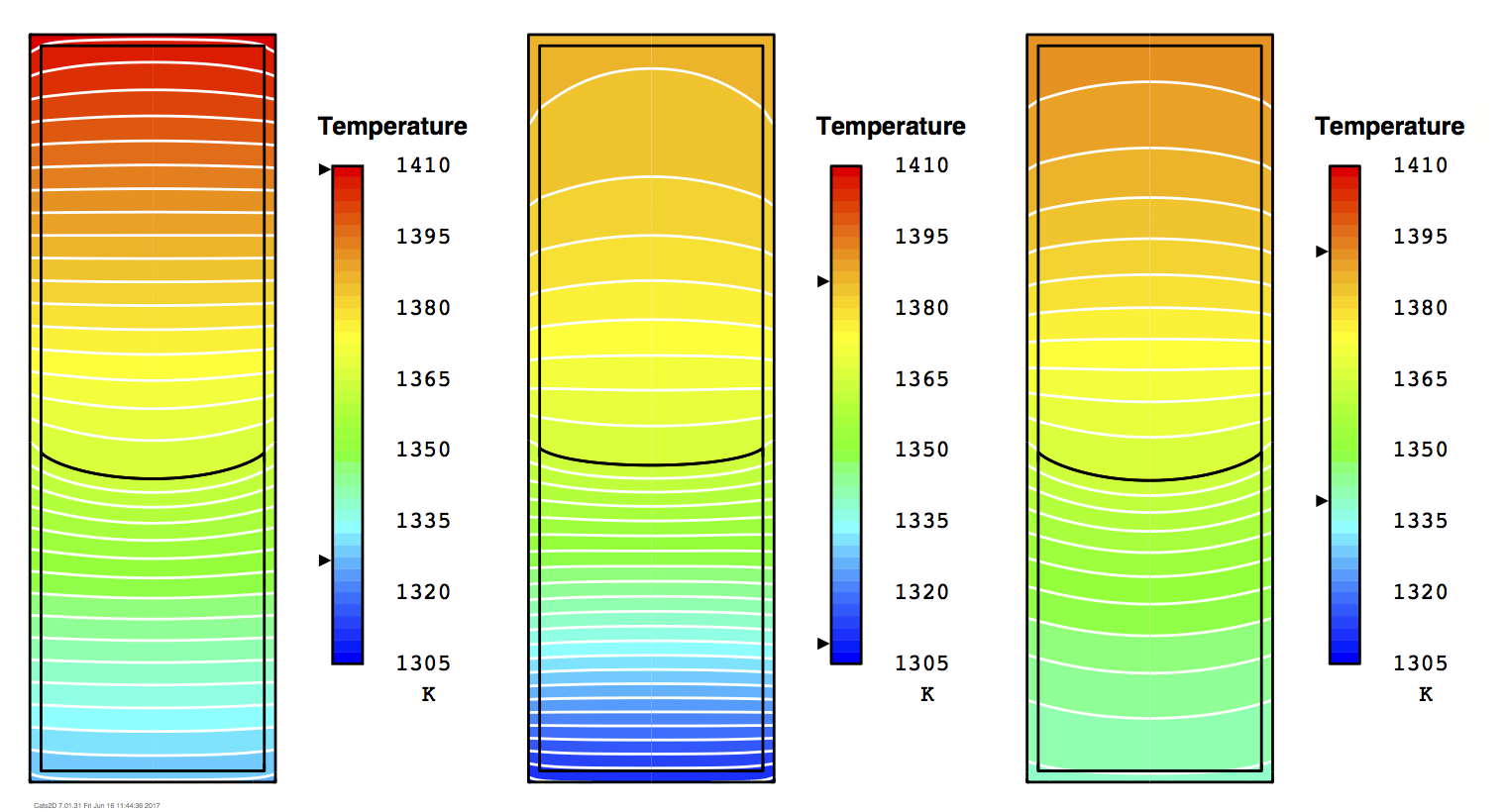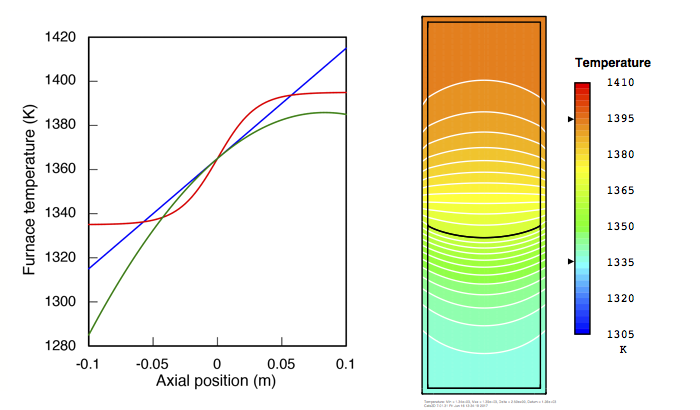 The results I've presented above are obvious, for the most part. To avoid interface bending, the gradient must be larger in the crystal than the melt, enough larger to both compensate for the difference in thermal conductivities and to carry away the latent heat of solidification. Otherwise heat must be forced out laterally. This strategy has already appeared in a few forms, for example the "cold-finger" furnace design employed by Ernesto Dieguez's group to create a large gradient at the bottom of the ampoule. Also, Zhang et al. (2012) have published these Cats2D results showing that a "bell-curve" profile can accomplish the same thing by imposing a sharp change in gradient at the growth interface.