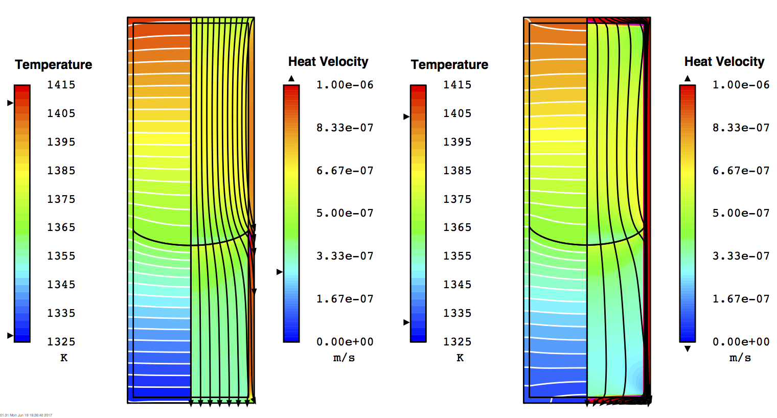Heat flux paths, plotted below for cases 2 and 3, show how heat flows outward when the melt is more conductive than the crystal, and inward when the converse is true. The interface bends because axial heat transfer is slower in one domain than in the other, owing to different thermal conductivities. The mismatch causes a radial thermal gradient to form that drives heat laterally at the interface. The larger the ratio of radial gradient to axial gradient, the greater the interface bending.