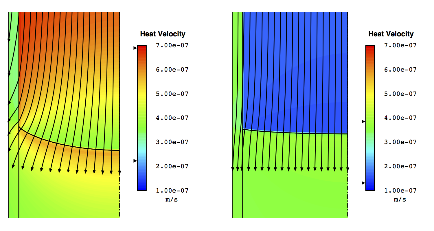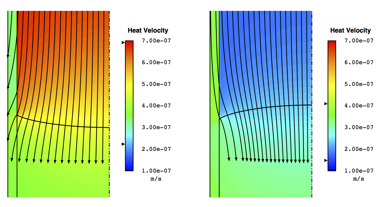 When conductivity is higher in the melt than the crystal (case 5, below left), the flow of heat through the melt slows down considerably near the interface where it is opposed by the release of latent heat. This deceleration magnifies the deflection of the paths. In the converse situation (case 6, below right), the flow of heat accelerates in the crystal where conductivity is higher than the melt. This acceleration is nearly enough to carry the latent heat through the crystal, which causes the paths to straighten out.