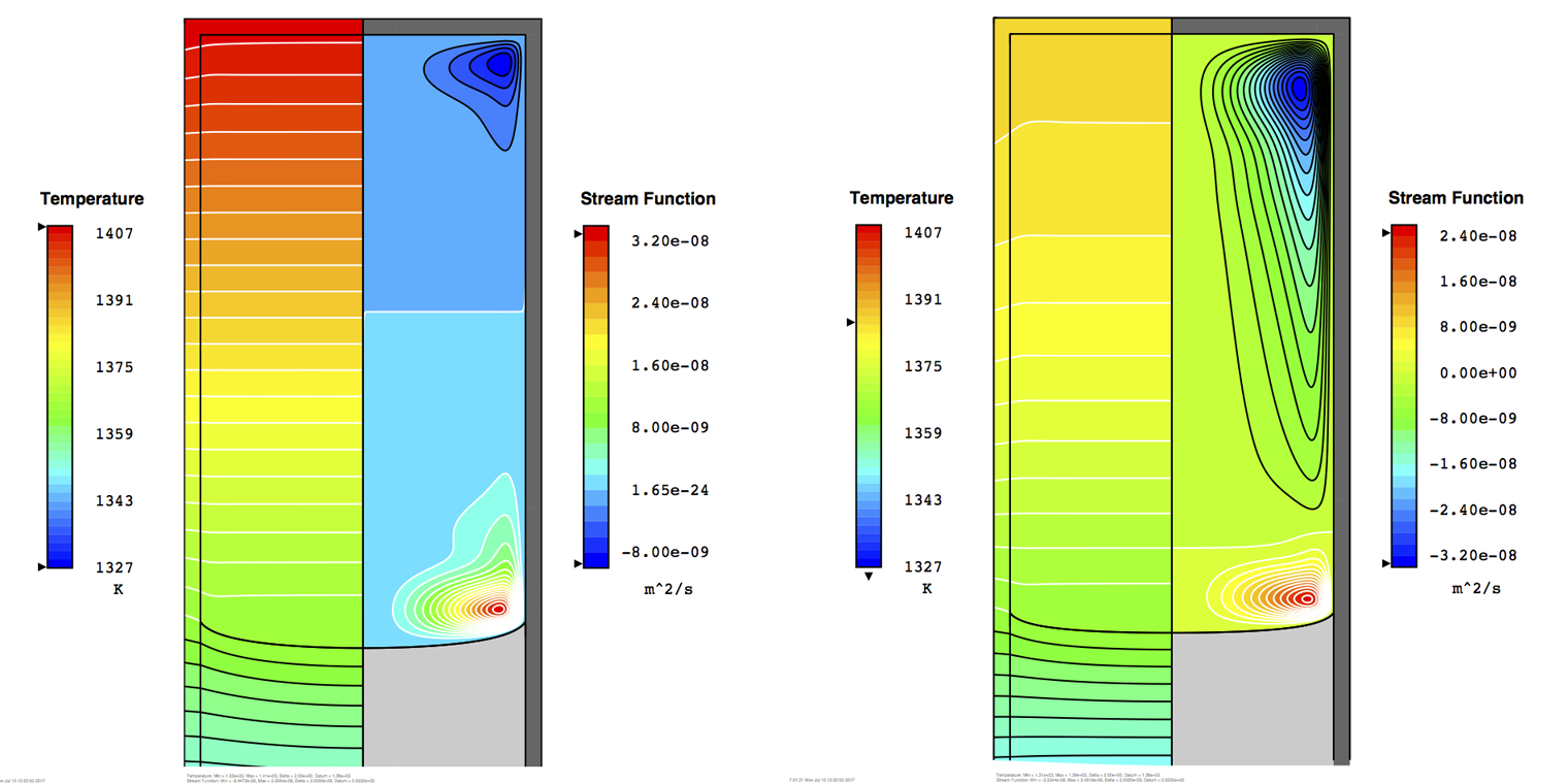 The upper vortex circulates counter-clockwise, rising up the wall and sinking in the center. The upper vortex is much stronger for the roll-off profile, which has a destabilizing gradient near the top, than the linear profile, which is strongly stabilizing throughout the melt. The lower vortex, which circulates clockwise, is much more important, however, since it helps to carry away latent heat generated at the interface. This results in a smaller thermal gradient at the melt side and lessens the heat that must be carried away through the crystal: