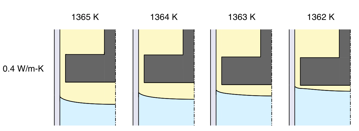 The most obvious difference is that most of the heat flow is diverted into the highly conductive graphite ampoule. Interface bending is greater in graphite, 33% compared to 26% in quartz. There is also a modest decrease in thermal gradient by 10% in the graphite ampoule, which can be seen by comparing the isotherm spacing in the two plots (and also by comparing the carets on the temperature legends). I've experimented with increasing the furnace gradient to compensate for this tendency in graphite, but reducing bending from 33% to 26% requires nearly doubling the furnace gradient to 959 K/m. Applying this same furnace gradient to the quartz ampoule reduces bending from 26% to 21%, so quartz is always at an advantage to graphite.