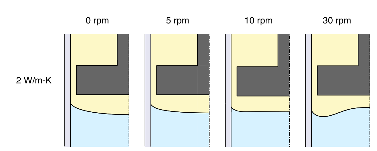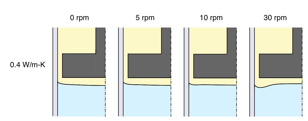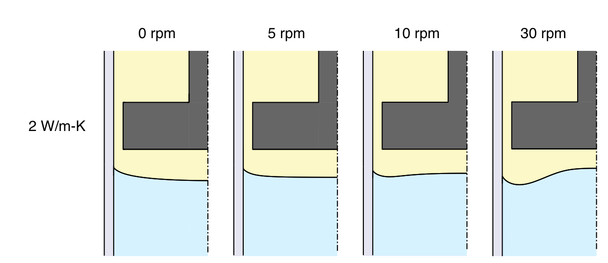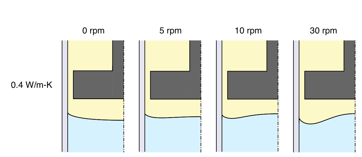 For the linear furnace profile, rotating the baffle at 5 rpm gives a slightly convex interface that seems pleasing. These next results show that faster rotation rates cause a large concave region to form around the perimeter, which seems undesirable: