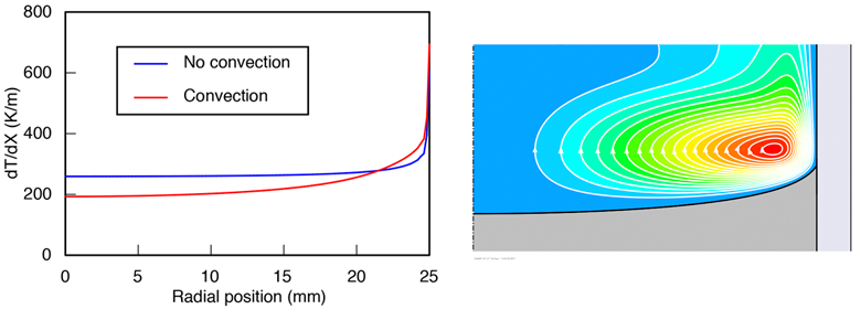 These results come with the caveat that convective heat transport, neglected here, is quite important in vertical Bridgman growth. Natural convection is always present, Marangoni convection can occur in non-confined melts, and forced convection may be induced by rotating or vibrating the ampoule. Quantitative work demands we include these phenomena when present. But in terms of growth interface shape, these effects can only mitigate bending to some degree. They cannot reverse it on their own, and sometimes they make it worse. We see how in the next section.