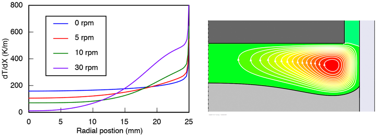 Pumping heat away from the interface causes the temperature gradient in the melt to drop. The curves shown below indicate that the gradient has fallen by half at 10 rpm. At 30 rpm, the gradient is close to zero near the center axis, a dangerous situation that should be avoided to prevent morphological instability. But it should be noted that mass convection away from the interface is also enhanced, which is a stabilizing influence.