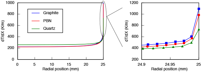Another important consideration is the thermal gradient on the melt side of the growth interface. The gradient at the interface is generally lower than the furnace gradient, primarily because of the latent heat released by solidification. Should the gradient fall too low, which may happen at higher growth rates, the growth interface will become morphologically unstable. Below on the left I show the gradient plotted along the entire interface for the 5 mm ampoules of each material, and on the right I show a magnified region near the wall (symbols indicate node locations to give a sense of the discretization.) The thermal gradient at the center axis, where it is lowest, is 221 K/m in the graphite ampoule, 223 K/m in the PBN ampoule, and 259 K/m in the quartz ampoule, all of which are much lower than the furnace gradient of 500 K/m. Quartz gains another advantage here for its tendency to support a thermal gradient better than the other materials.