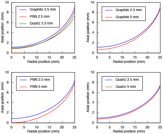 These results are summarized in the plots below, which show growth interface shape with the vertical dimension exaggerated by a factor of two. The upper left plot shows shapes in ampoules with a wall thickness of 2.5 mm. The graphite and PBN interfaces have nearly the same shape, but the PBN interface is lower in the ampoule due to its low conductivity in the lateral direction. The quartz interface is lower in the ampoule for the same reason, but obviously exhibits less bending, due to its low axial conductivity. It should be noted that graphite and PBN ampoules are both made thicker in practice than quartz ampoules, due to mechanical weakness of these materials, so I've shown plots to compare interface shape in 2.5 mm and 5 mm ampoules of each of these materials. Interface bending is worse in the thicker ampoules due to a decrease in lateral heat conduction. The effect is large in graphite and PBN ampoules, because the thicker ampoule provides a larger cross-section for channeling heat. In the quartz ampoule there is hardly any effect because this channeling effect is largely absent.