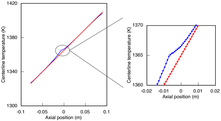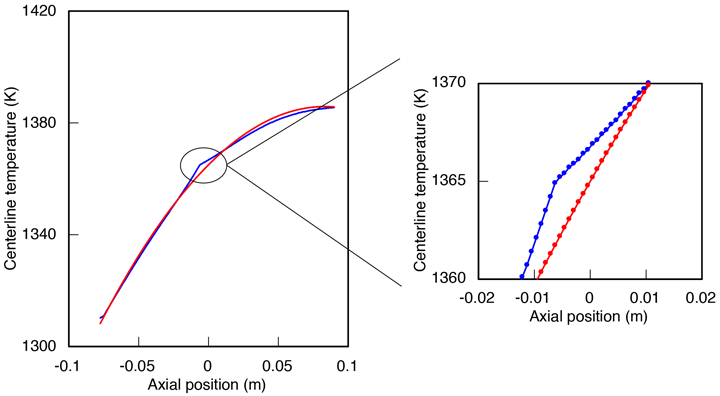 In the plots below, I show how the temperature varies along the center axis of the ampoule (the blue curve) compared to the furnace profile (the red curve), for both the linear and roll-off profiles. In the upper and lower regions of the ampoule, the center axis temperature follows the furnace temperature closely except near the interface, where it is elevated by several degrees K. The maximum difference between the blue curve and red curve occurs at the interface. It is about 5 K for the linear profile, shown first: