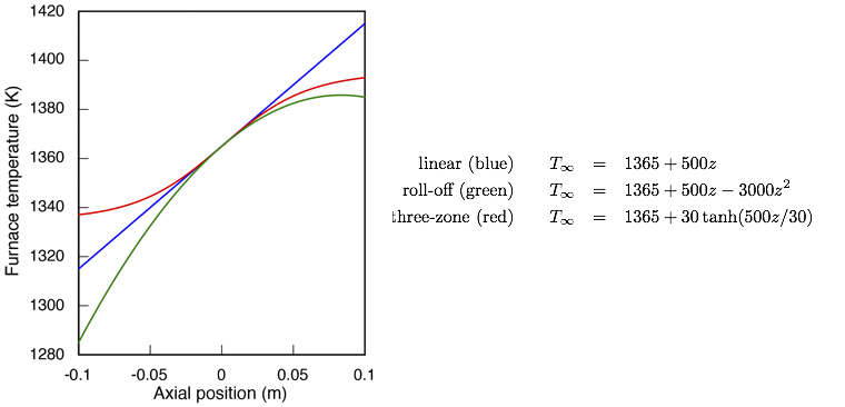 The degree of bending is strongly affected by the axial temperature distribution in the furnace. I've considered three different temperature profiles, shown below. A linear profile of constant gradient is used unless specified otherwise. Other profiles studied are the roll-off type of profile used in Yeckel et al. (1999), and the three-zone type used in Kuppurao et al. (1995) in which hot and cold zones are separated by an insulated zone.