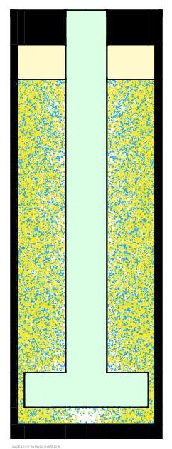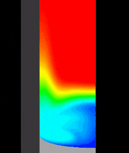 These simulations make a lot of sense intuitively. Before I ran them, Goodwin showed me some simulations he had obtained at high values of Reynolds number. His results looked weird because the liquid collects at the top of the cylinder, somehow suspended there against gravity. I'm showing a similar solution below that I computed for a 10 cm radius cylinder spinning at 1.4 m/s (1466 rpm), much larger and faster than anything shown above. I've reduced the surface tension by a factor of five but left the other properties the same, which is similar to a 1 centipoise silicone oil. The Bond number is 5000 and Reynolds number is 1.4 X 105.