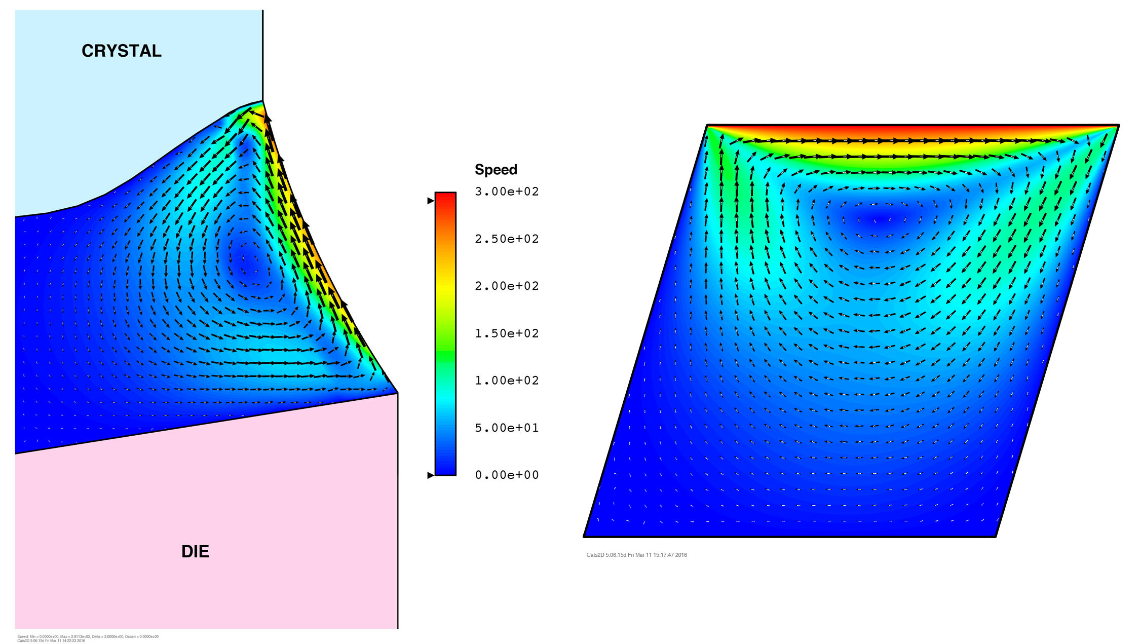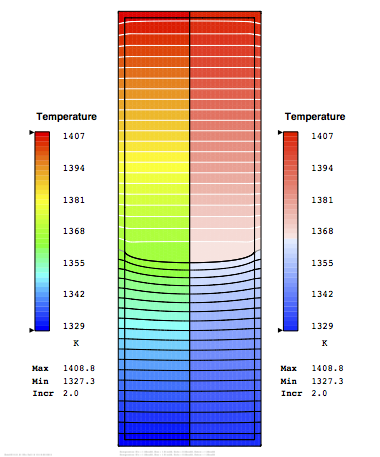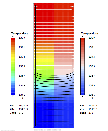 Cats2D now rotates and mirrors plots if desired. These actions are particularly useful for axisymmetric problems in which the symmetry axis is oriented vertically, true of many crystal growth systems. Internally, Cats2D uses the X-axis as the symmetry axis, resulting in a horizontally oriented display that gives an unnatural view of these systems, like shown here for the EFG system: