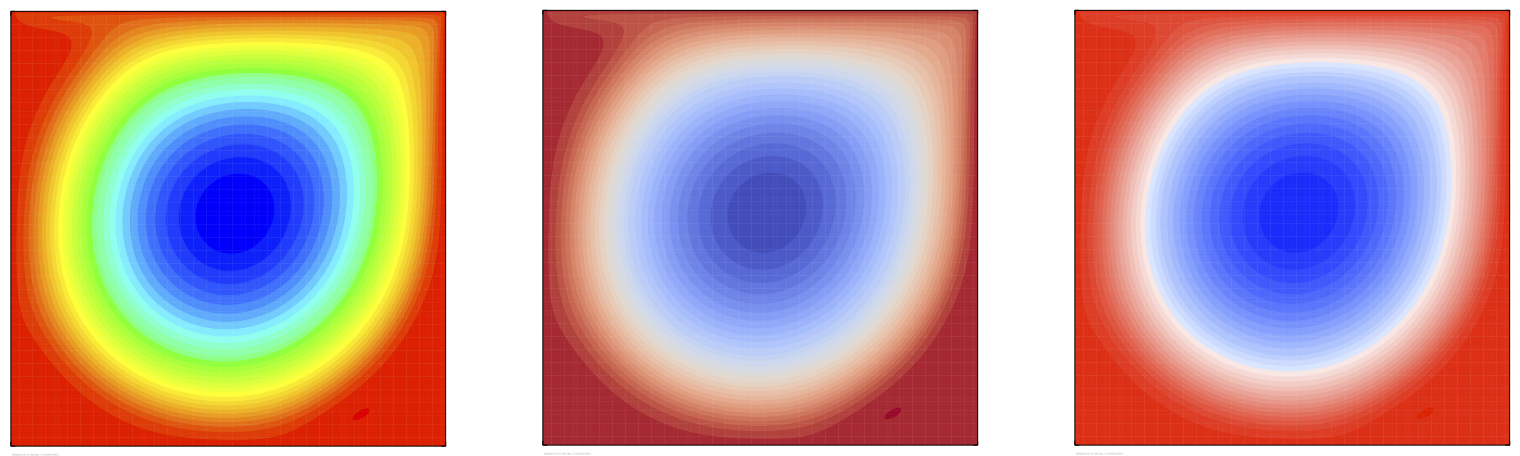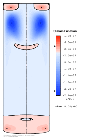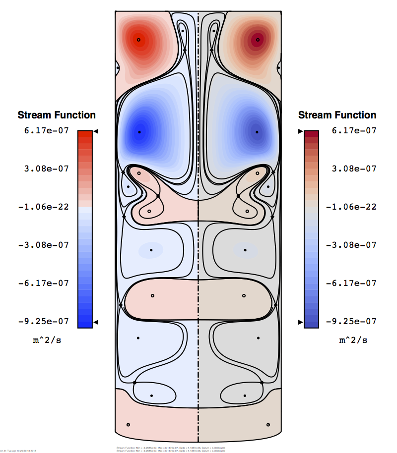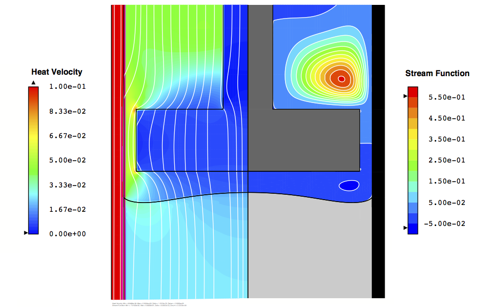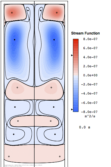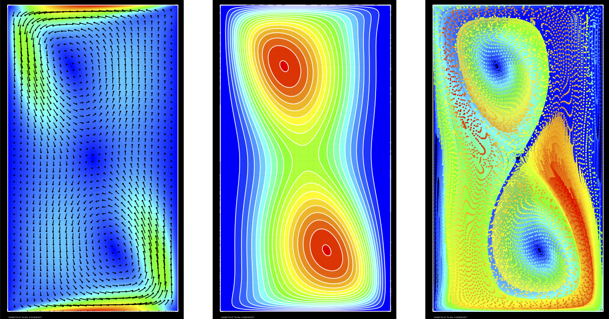 In the graphics options menu it is possible to set contour shading to black, white, or color. Typically black and/or white contours are plotted on a background color image of the field being contoured. Color contours, on the other hand, are best plotted on a black or white background. Examples of these styles can be seen here. The color contours in these examples are shaded by the field being contoured. Recently I've added the option to shade contours of one field by the color values of another field. For example, I can plot streamlines that are shaded by temperature, as shown here for these buoyancy driven flows in a cavity heated from below.