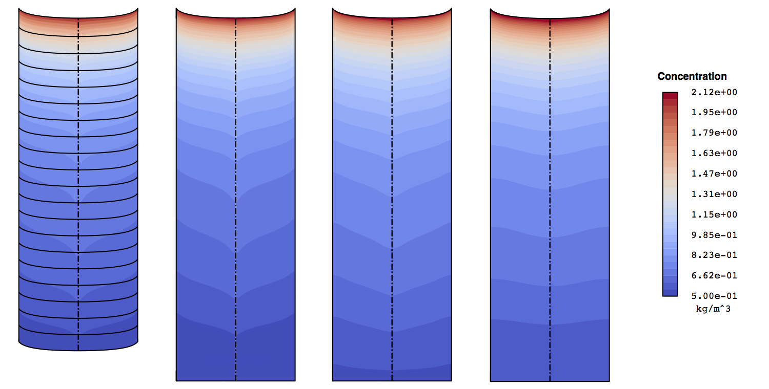 A scary bug, too. It's been in the code since 2009 when I made a small change in the capillary-traction boundary condition for a problem I was studying at the time. The bug only affects problems in which the free boundary intersects an open flow boundary. Before 2009 the code handled this situation correctly for the planar case, but not the axisymmetric case. I fixed the code, tested the axisymmetric case, and moved on. Whoops! I didn't test the planar case, which I had inadvertently broken. Programming is that way: fix one thing, break another. I never noticed it before because this situation doesn't come up in the crystal growth problems we usually study.