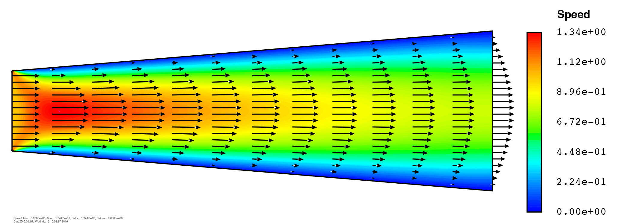 This style of vector plot mostly pertains to simple flows that are nearly unidirectional, such as channel or free stream flow. There is a textbook feel to this representation, and it might be particularly useful for developing educational materials, but I don't think I will use it much in my day to day work. Here is one more example before we move on, flow in a diverging channel, just because it looks cool.