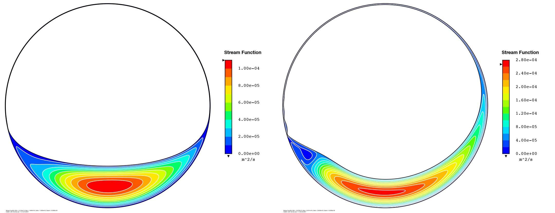 Here is a fun time waster suggested by Goodwin. These are steady state simulations of a fixed volume of liquid inside a spinning cylinder, sometimes called the rim coater. The volume fraction is 0.19, rotation is counter-clockwise, and gravity points downward. Properties are approximately those of water: viscosity is 10-3 Pa-s, density is 103 kg/m3, and surface tension is 0.1 N/m. I really like round numbers, so I've set gravitational acceleration to 10 m/s2. Cylinders of 1 and 2 mm radius, spinning at 10 cm/s (approximately 105 rpm), are shown first.