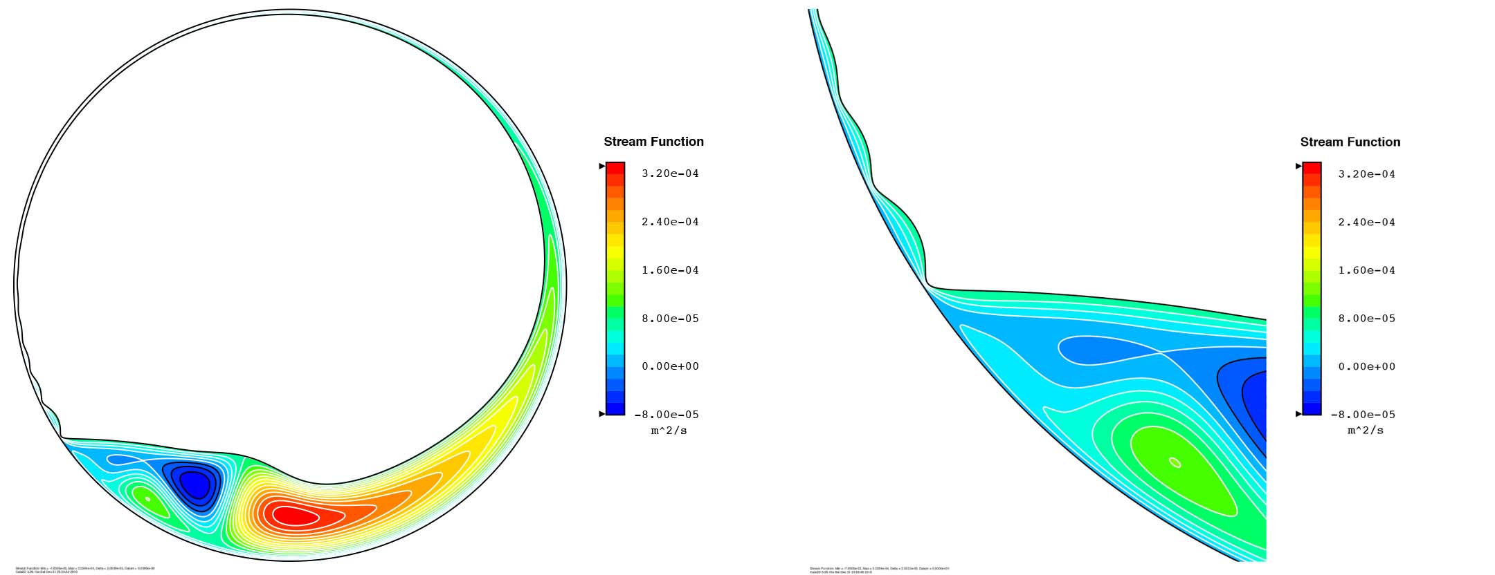 Around 574 rpm the solution becomes unstable at a turning point (saddle-node bifurcation), shown below. The surface waves have become pronounced and the film has nearly pinched off where it enters the pool. An interesting flow structure, a vortex pair connected by a saddle point in the stream function, has emerged in the pool.