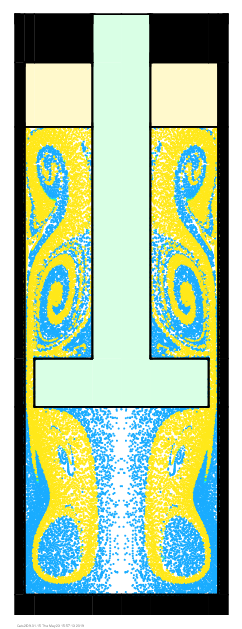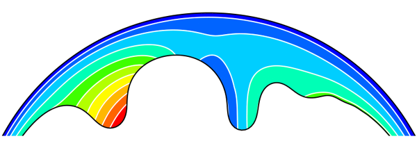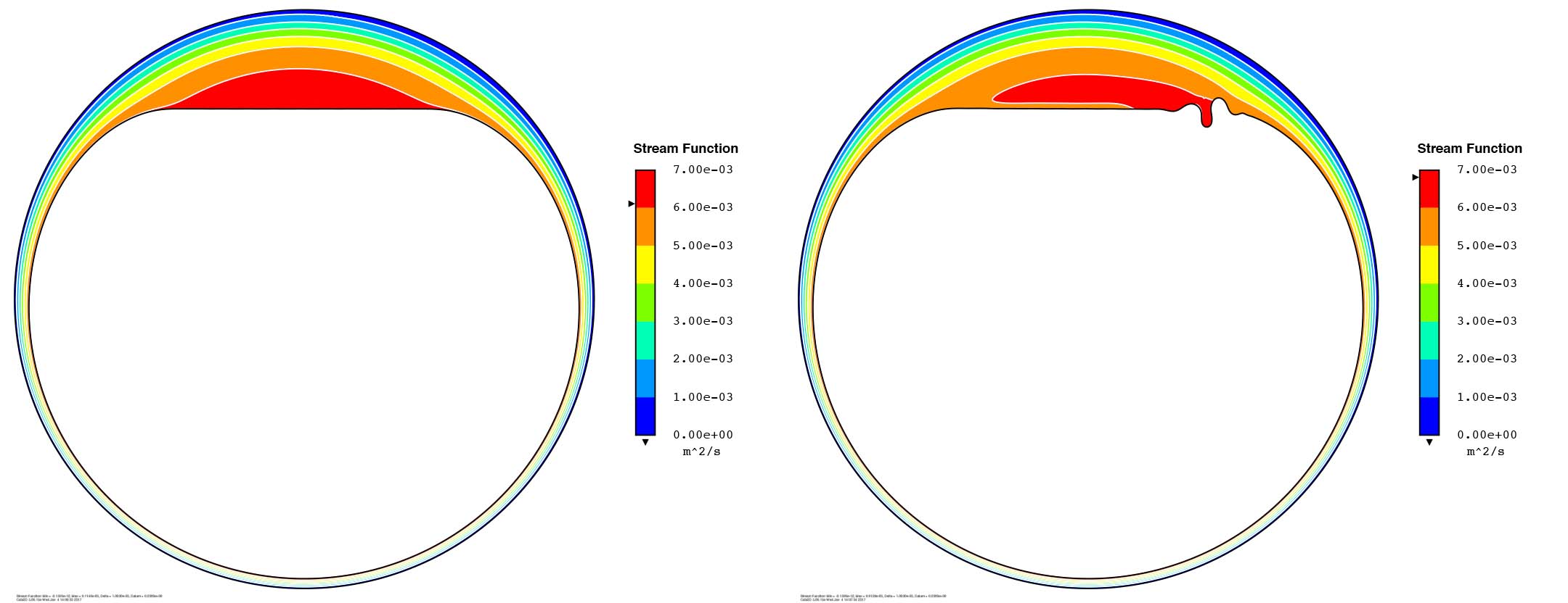 Inertia is sufficient to hoist the liquid to the top and hold it there. Unlike the situation depicted earlier where it collects at the bottom, there is no recirculation in this pool. The liquid decelerates sharply but continues around in its entirety with the spinning cylinder. This solution is a converged steady state, but it is not stable. Time integration shows an unstable evolution of the free surface, easily set off by numerical noise, that manifests as dripping.
