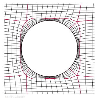 Cats2D uses elliptic mesh generation on a structured mesh of quadrilateral regions. The user is responsible for decomposing the domain into these regions. Here is one way to decompose a circle, with a diagram showing the logical arrangement of regions in the computational space. Compass directions must be assigned to each region to define its orientation with respect to the other regions.