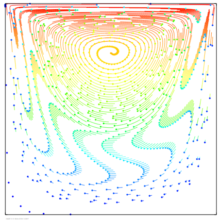 Here is a completely different situation, that of a recirculating flow in the lid-driven cavity at Reynolds number equal to 0 (top images) and 5000 (bottom images). The vector plots look pretty good, but they miss out on some of most interesting aspects of this flow. They show that the central vortex shifts downward to a more rotationally symmetric flow at high Reynolds number (closer to the inviscid limit), and that boundary layers develop near the enclosure walls. The extent of the inviscid core is fairly obvious. But they completely miss the flow separations in the lower corners, and on the upper left wall at Re = 5000. The vector plots are useful, but more as a supplement to a good streamline contour plot than in lieu of one.
