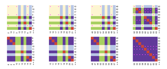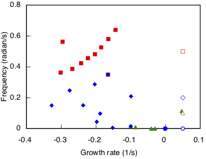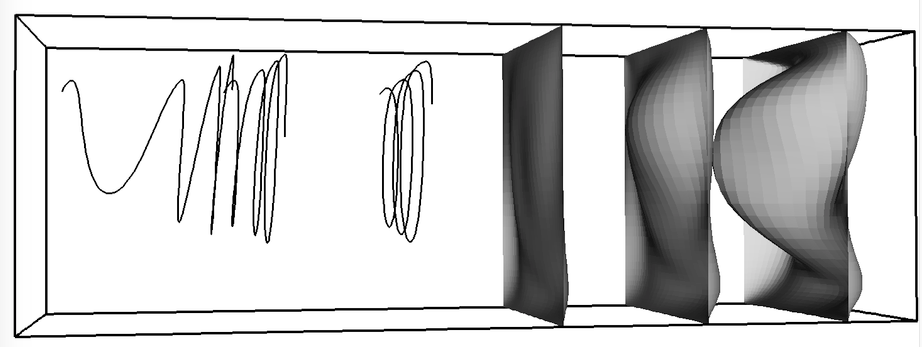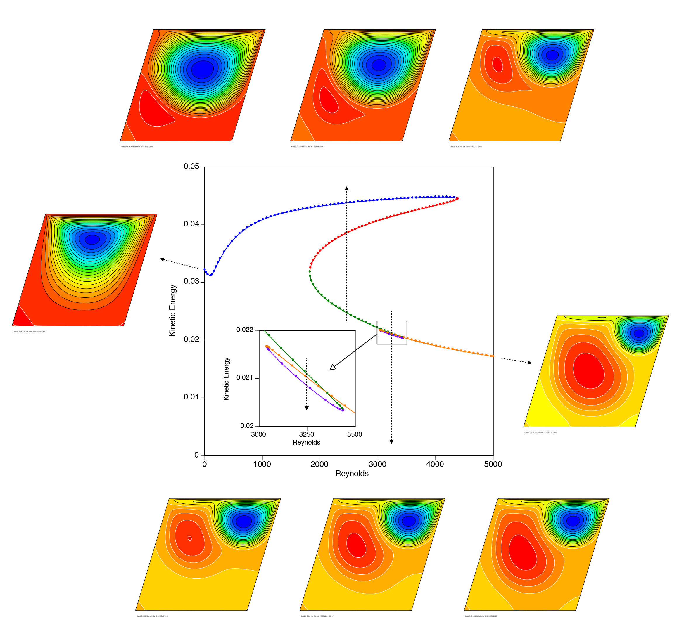 Goodwin says this figure looks crowded and confusing. I say it looks science-y and beautiful. I want to puzzle over it. Just looking at it makes me feel smart. But to help him understand it better, the initial solution at Re = 0 is shown on the left, and the final solution at Re = 5000 is shown on the right. The three flow states shown above the plot coexist at Re = 2500 (left to right, on the blue, red, and green branches). The three flow states shown below the plot coexist at Re = 3250 (left to right, on the green, purple, and orange branches).