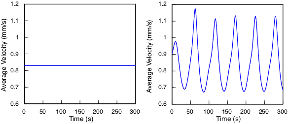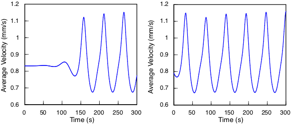On the right is shown the same solution computed on two discontiguous regions that represent left and right halves of the geometric domain. Here I have specified that the left boundary of the left region is periodic with the right boundary of the right region, and the other boundaries have no-slip conditions. This is spatially equivalent to swapping the left and right halves of the domain. This is not, strictly speaking, a periodic problem, but it shares the essential characteristic that the solution variables and their gradients must match at two boundaries that differ only by a spatial translation.