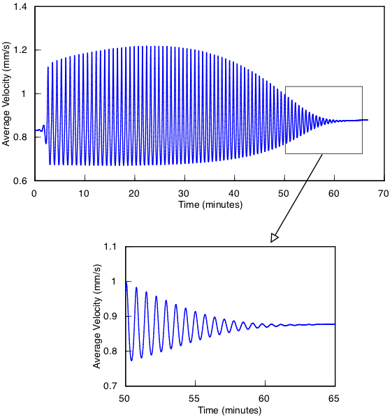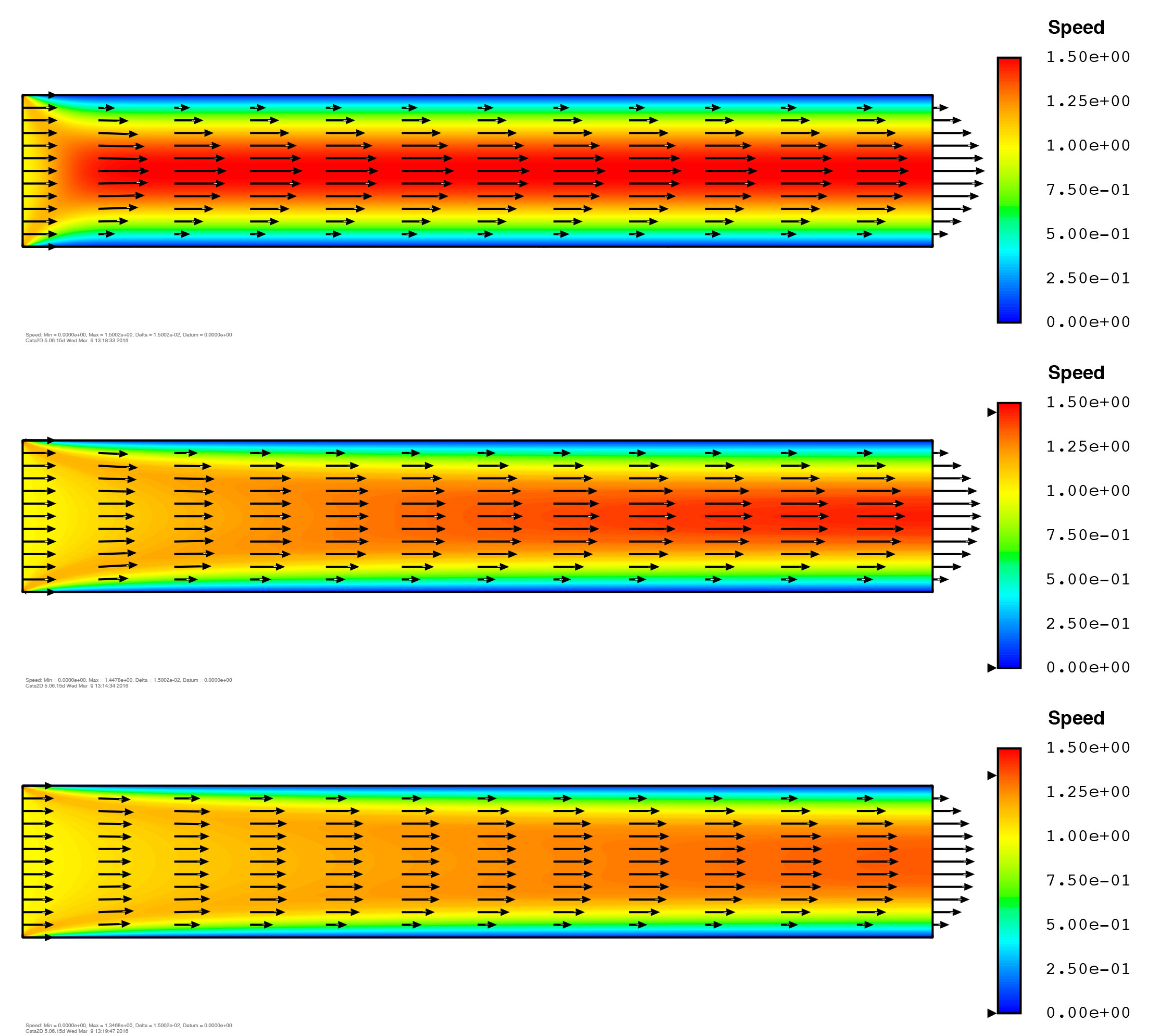 Here is a vector plot that illustrates the evolution of a flow profile at cross sections along a channel. The Reynolds number is 0, 200, and 400 from top to bottom. Cats2D makes it very easy to generate these plots, by the way. I think these plots do an excellent job illustrating the rearrangement of a plug flow as it enters a channel, and how adding inertia alters and slows this rearrangement.