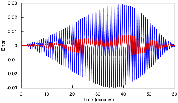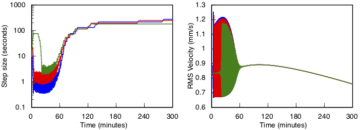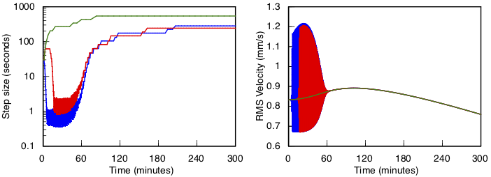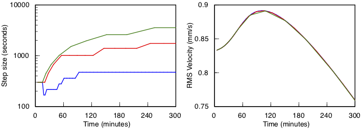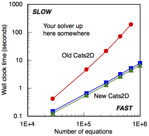 Goodwin reports that he has achieved a 15% speedup of the solver. He's been bugging me to add a celebratory note about it to the web site. I could tell him to get lost and start his own web site, but I am going to indulge him to keep the peace. So just how big is a 15% speedup? Check the plot below to see for yourself. The blue line is the New Cats2D before the speedup, and the green line is the New Cats2D after the speedup.