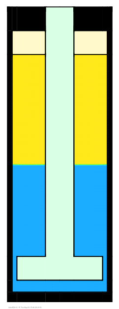 Another interesting flow regime pointed out by Goodwin resembles more a classic hydraulic jump induced by inertia than it does a stream entering a pool. To observe a jump I've reduced the volume fraction of liquid in the cylinder by a factor of four. The result shown below is for a 2 centipoise silicone oil in a 1 cm radius cylinder spinning at 0.35 m/s (366 rpm).