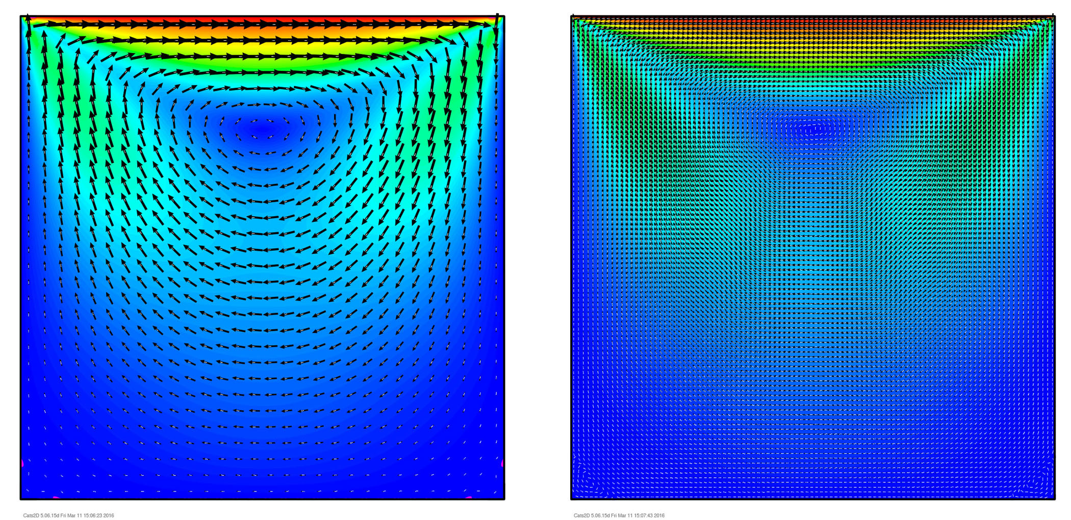 Note that coloring of arrows in vector plots is controlled by the same contour shading options. Here are vector plots created under the same settings as the plots shown above. Although the convective effect on temperature is also easily seen here, the plot on the right gives a poor visualization of the flow, in keeping with my comments above about vector plots.