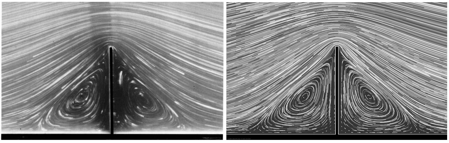 Yes, they do look similar. Taneda's photograph of flow past a fence was published in 1979, the year I dropped out of high school (Goodwin, meanwhile, was on station in the Persian Gulf). My Cats2D simulation was computed just now, forty years later. What took so long!