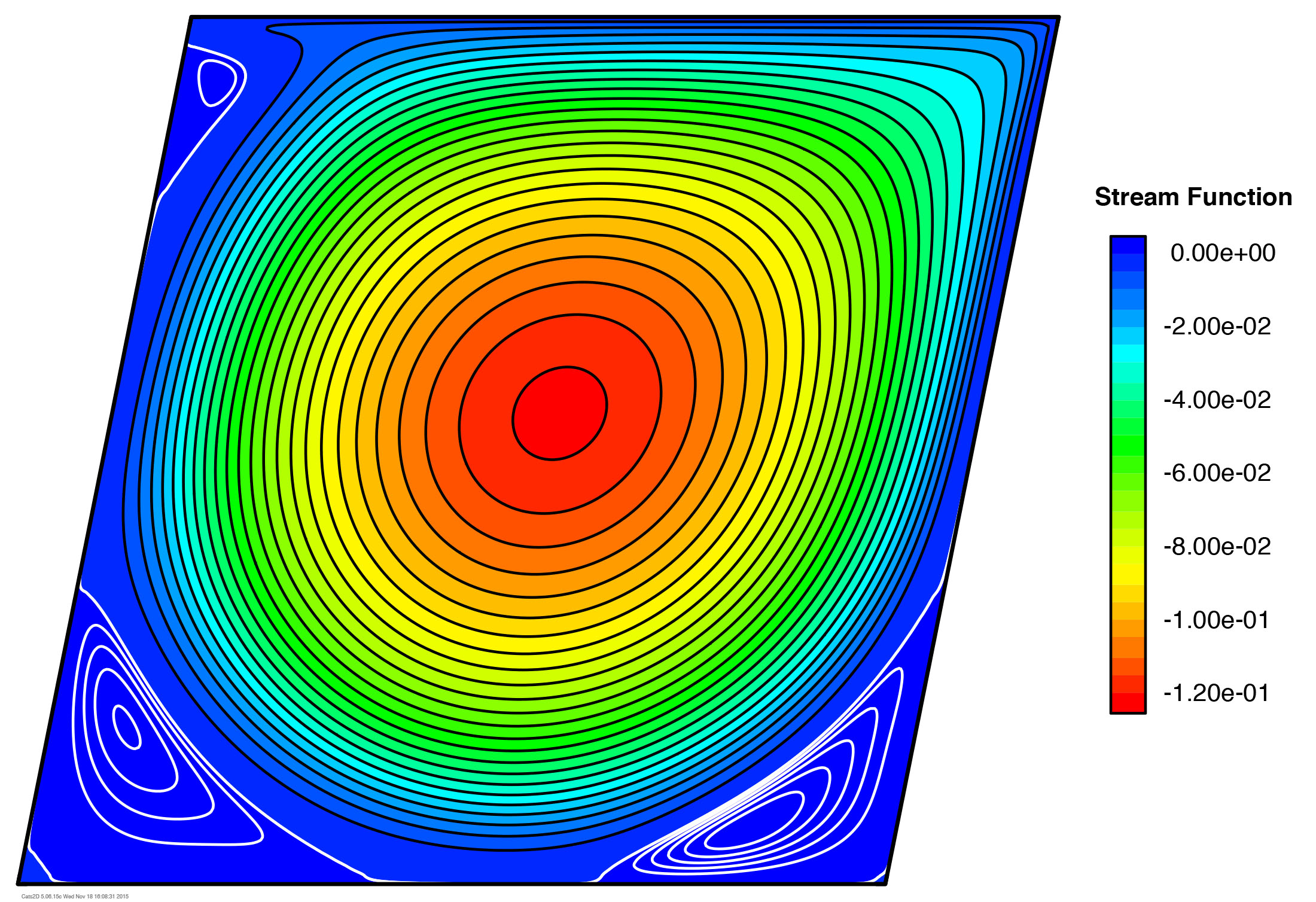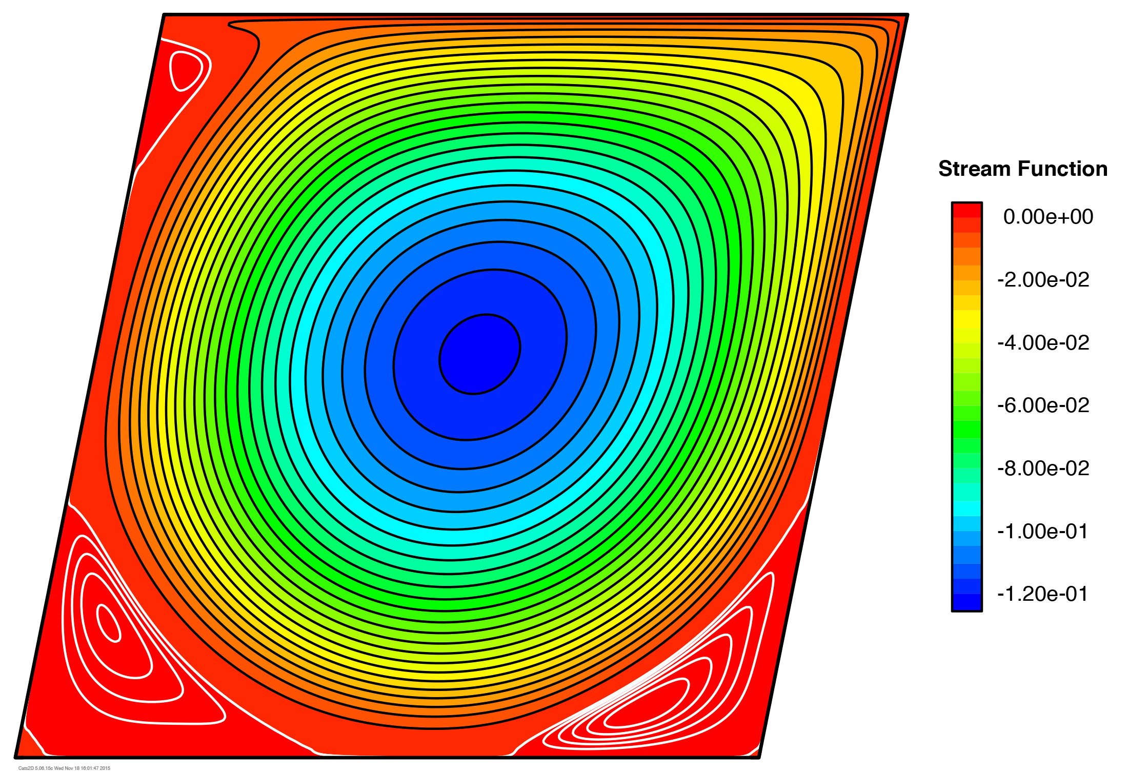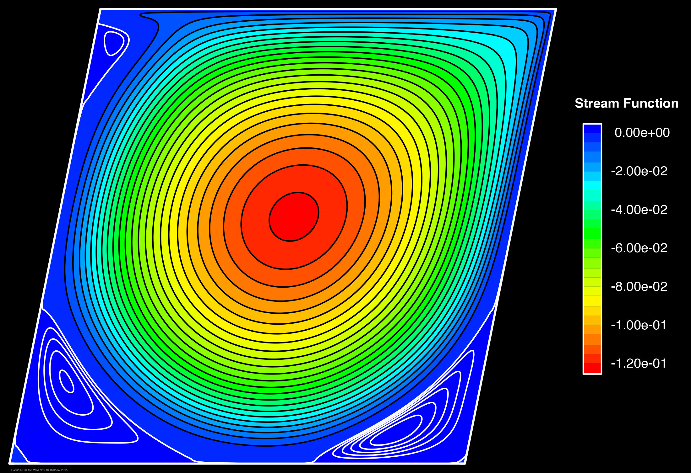 Cats2D creates high resolution images in EPS format. A wide range of styles are available for contour plots, some of which are illustrated below using the tilted lid driven cavity problem. These images have been down-sampled to 300 dpi for display here. The solution shown here was computed at Re = 5000 on a stretched mesh of 100x100 biquadratic elements.