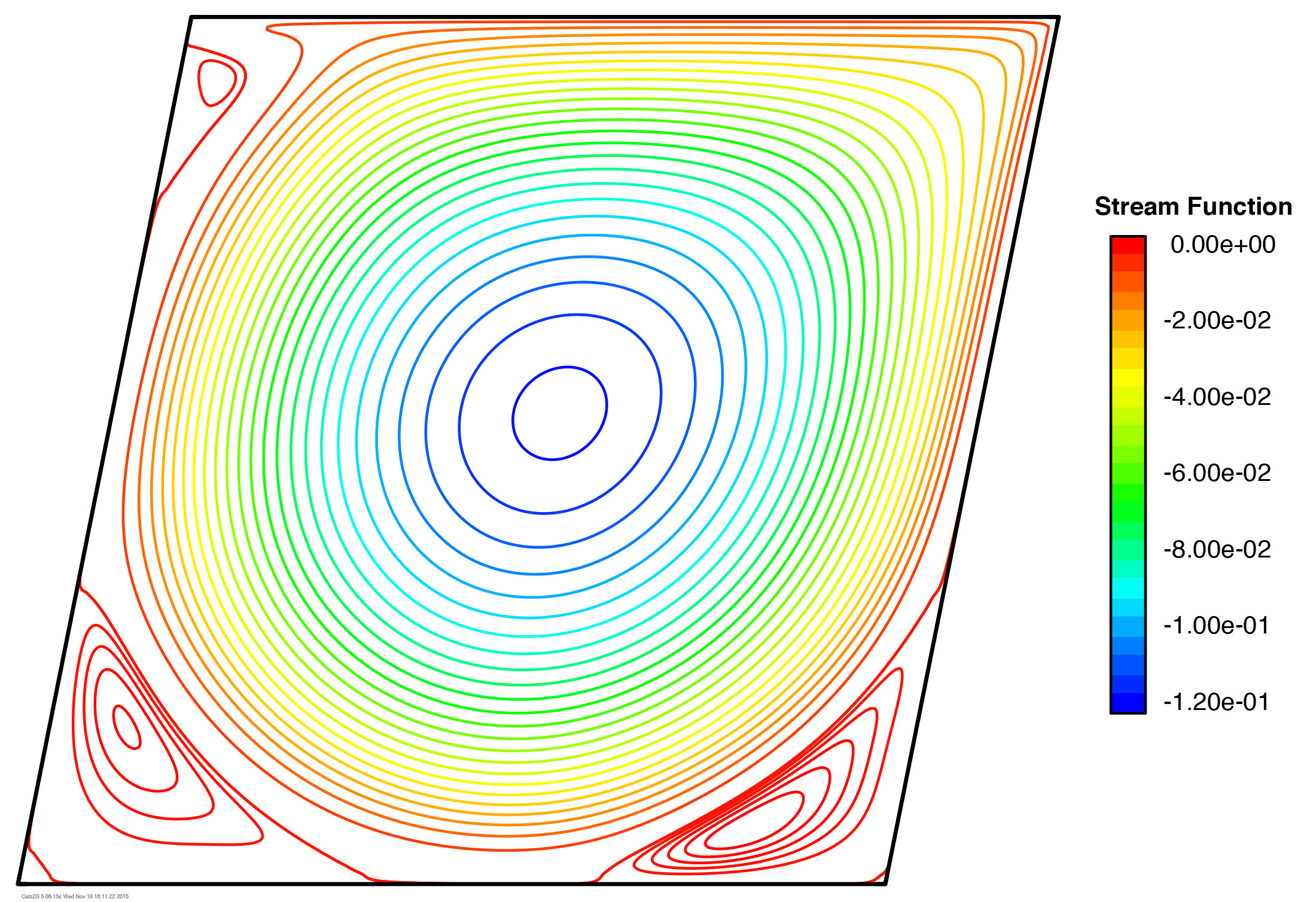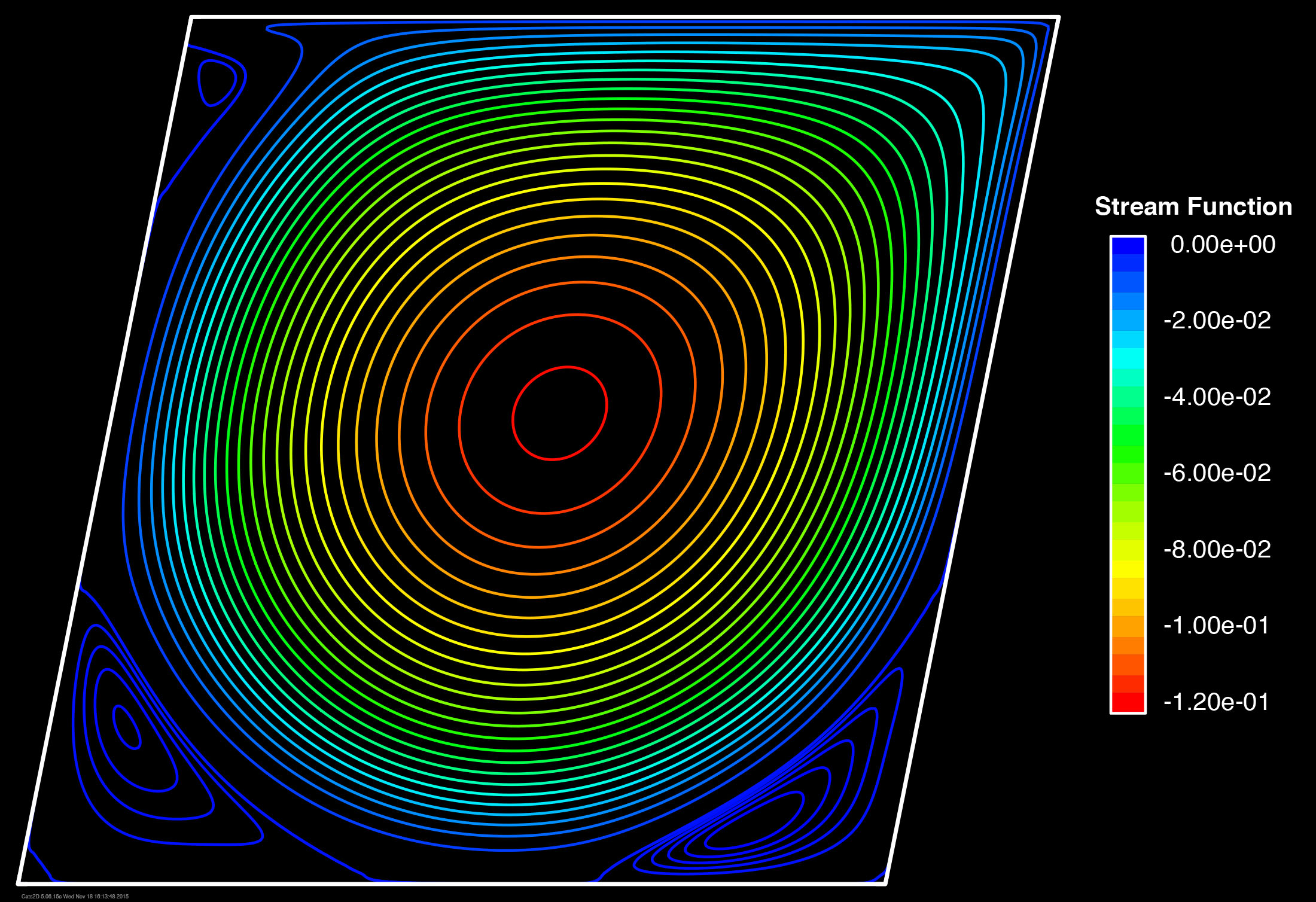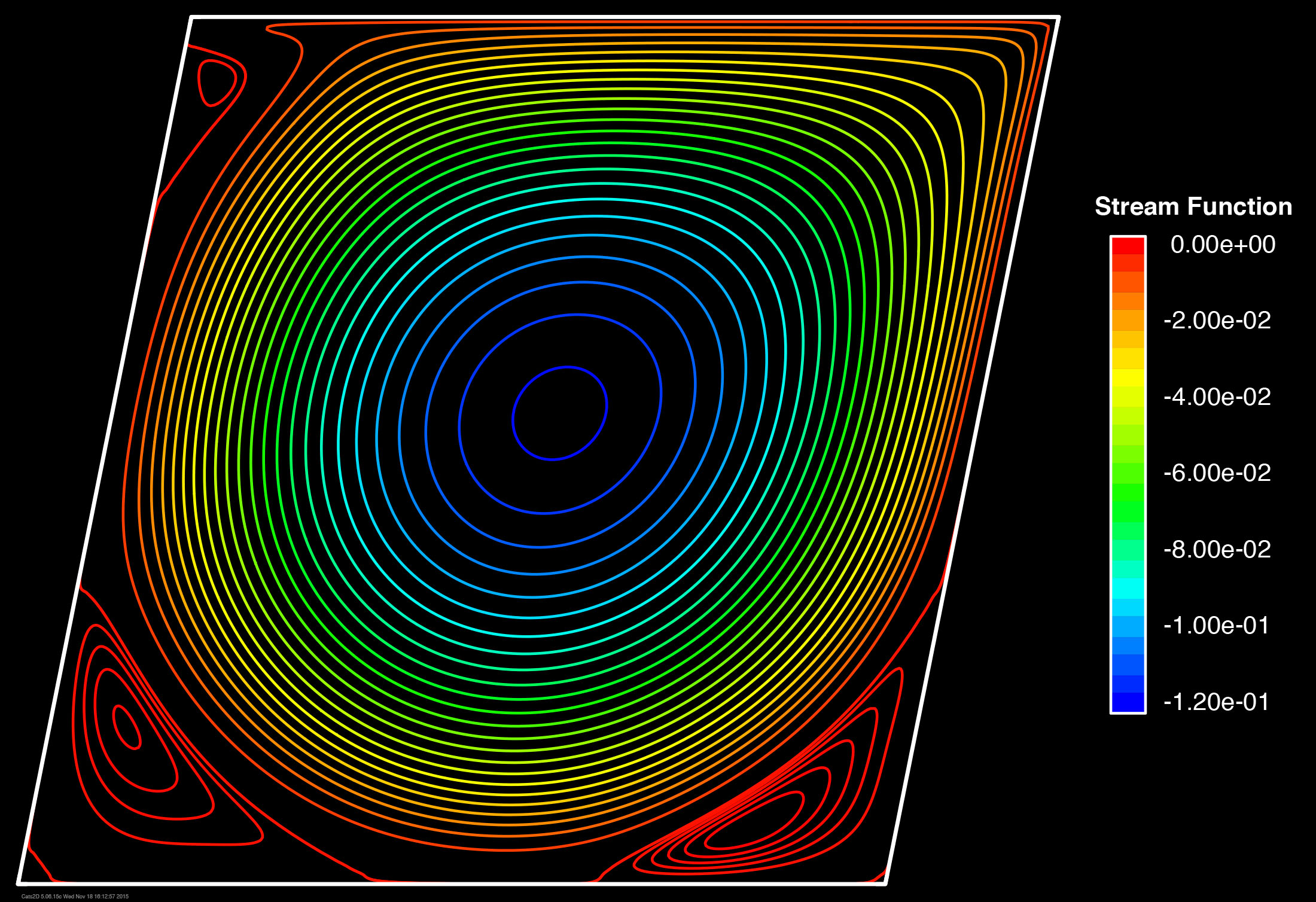 Cats2D creates high resolution images in EPS format. A wide range of styles are available for contour plots, some of which are illustrated below using the tilted lid driven cavity problem. These images have been down-sampled to 300 dpi for display here. The solution shown here was computed at Re = 5000 on a stretched mesh of 100x100 biquadratic elements.