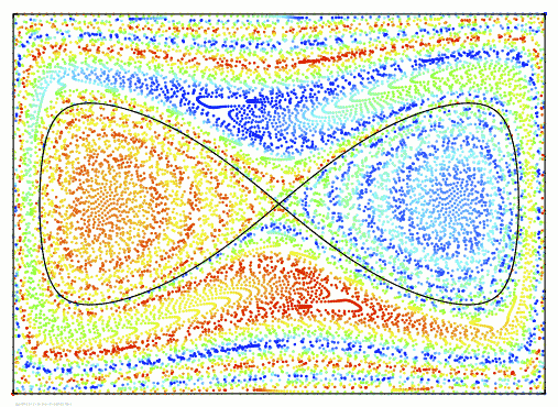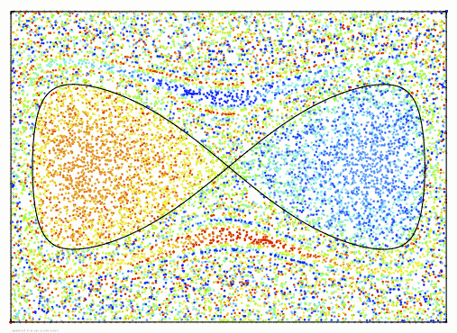 Unmixing of colored particles in a lid-driven cavity, with left and right boundaries translating in opposite directions. This flow has a saddle streamline that separates flow into a pair of co-rotating vortexes around which an outer flow recirculates. The initial condition is obtained by mixing the fluid for 50 dimensionless time units. Four spiral arms, two on each side of the cavity, form each time unit, so this is quite a long time with much mixing. Then the flow is reversed (it's Stokes flow, so it's physical). Watch it unmix by mousing over the images: